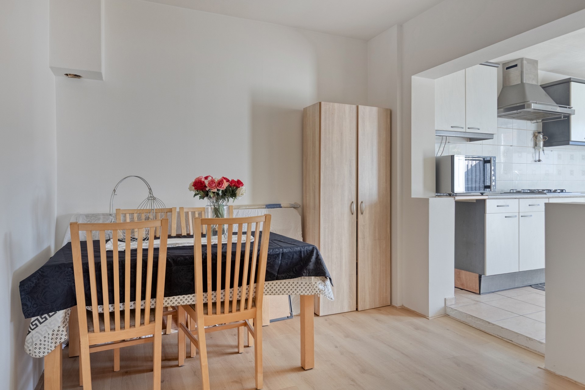 De eetkamer bevindt zich centraal in de woning en vormt een prettige verbinding tussen de woonkamer en de keuken. De keuken is praktisch opgesteld en biedt voldoende werk- en bergruimte. Aansluitend vind je de bijkeuken met extra opstelmogelijkheden voor witgoed en toegang naar buiten, ideaal als achterom of voor extra opslag.