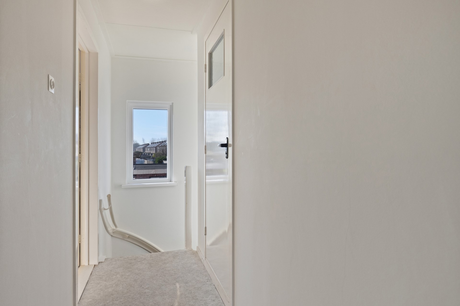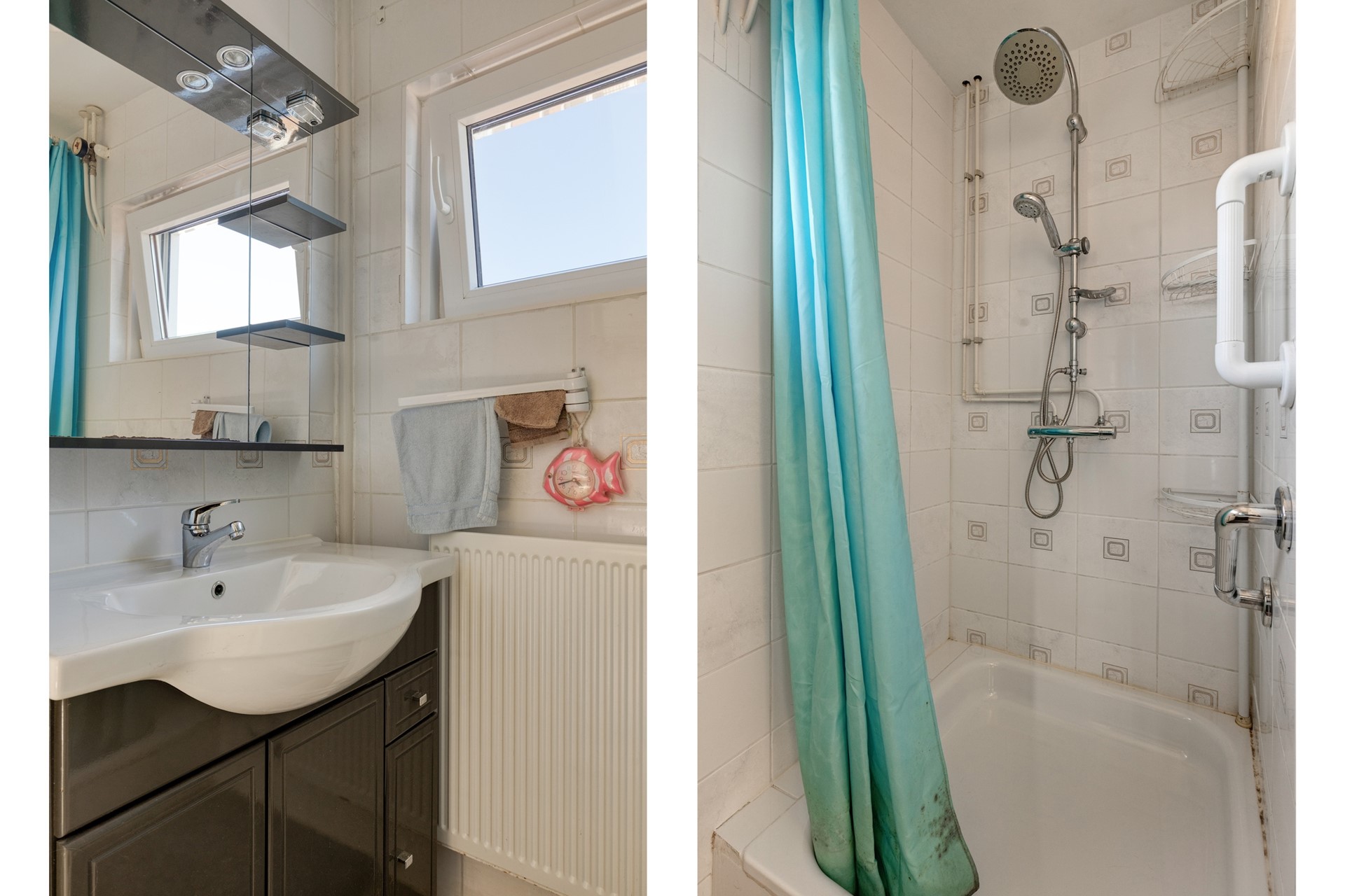 De badkamer is compact maar functioneel ingericht en voorzien van douche en wastafel. Op de overloop is daarnaast nog een praktische kast aanwezig.