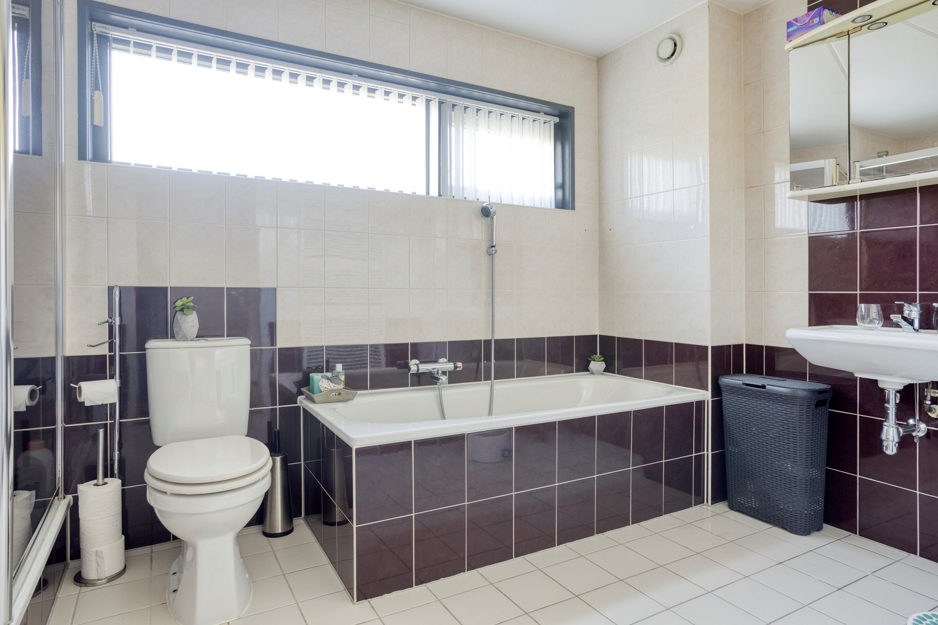 Op de eerste verdieping komt u op de overloop met toegang tot drie volwaardige slaapkamers, allemaal prettig van formaat. De badkamer is compleet uitgevoerd met ligbad, douche, wastafel en toilet. Dankzij de rechte gevels is de ruimte optimaal benut en voelen de kamers licht en comfortabel aan.